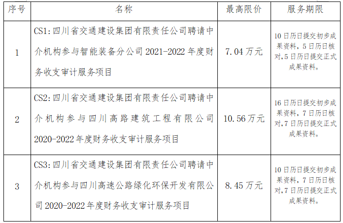 聘请中介机构参与2022年度智能装备分公司、四川高路建筑工程有限公司(以下简称高路建筑公司)、四川高速公路绿化环保开发有限公司(以下简称高路绿化公司)财务收支审计服务项目,由华体(中国)作为招标人,通过公开招标方式选择和确定中标人。